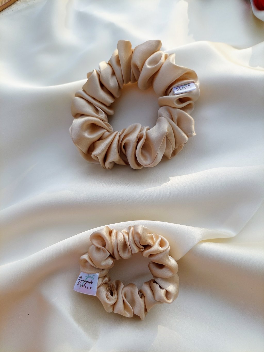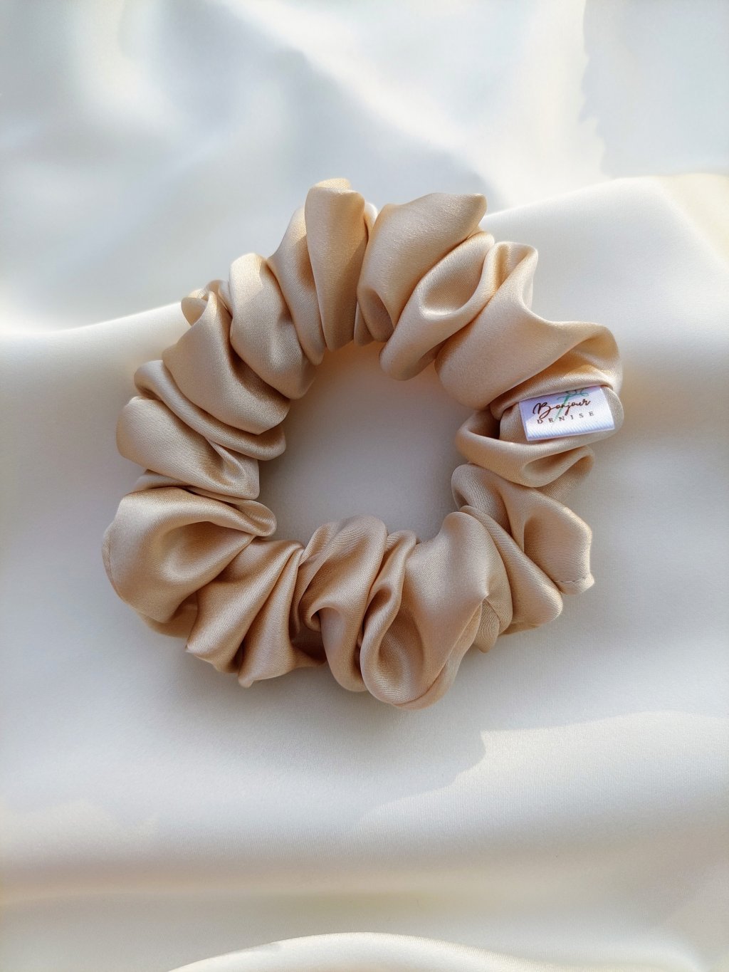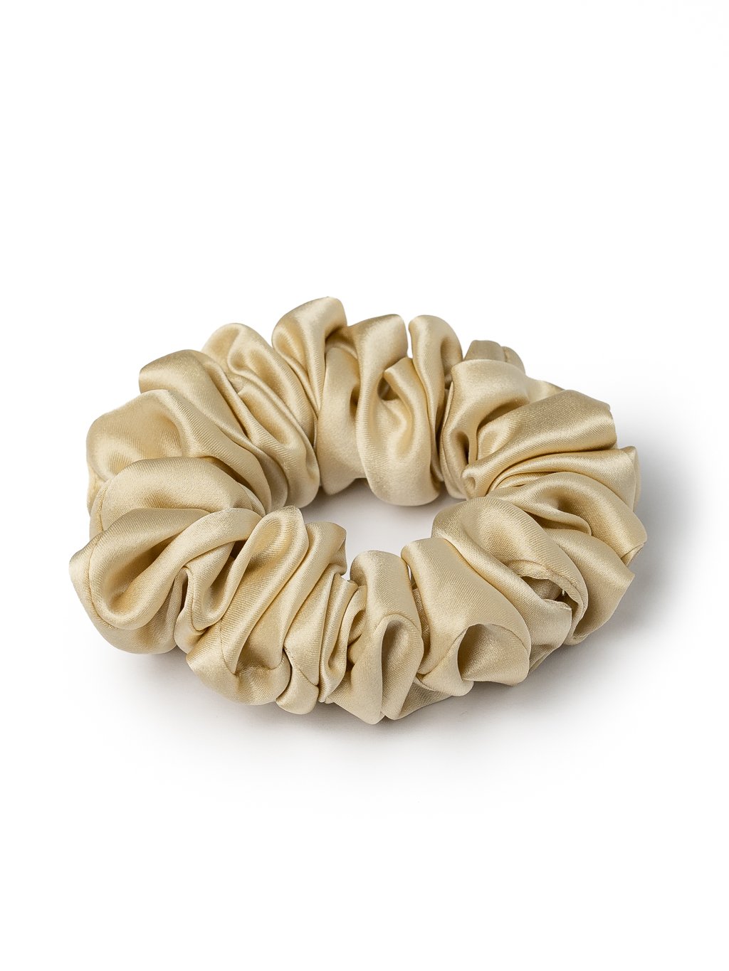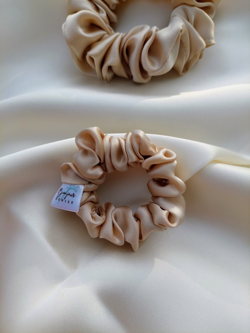 Tato scrunchie gumička je vyrobena ze 100% hedvábí, což z ní dělá jedinečný a luxusní doplněk pro vaše vlasy. Její krásná béžová barva dodá vašim účesům neutrální a přirozený vzhled.