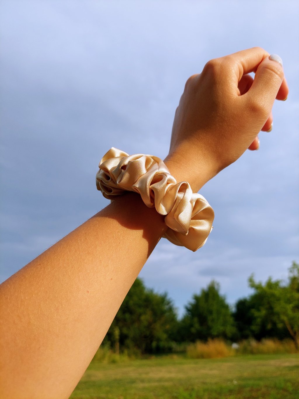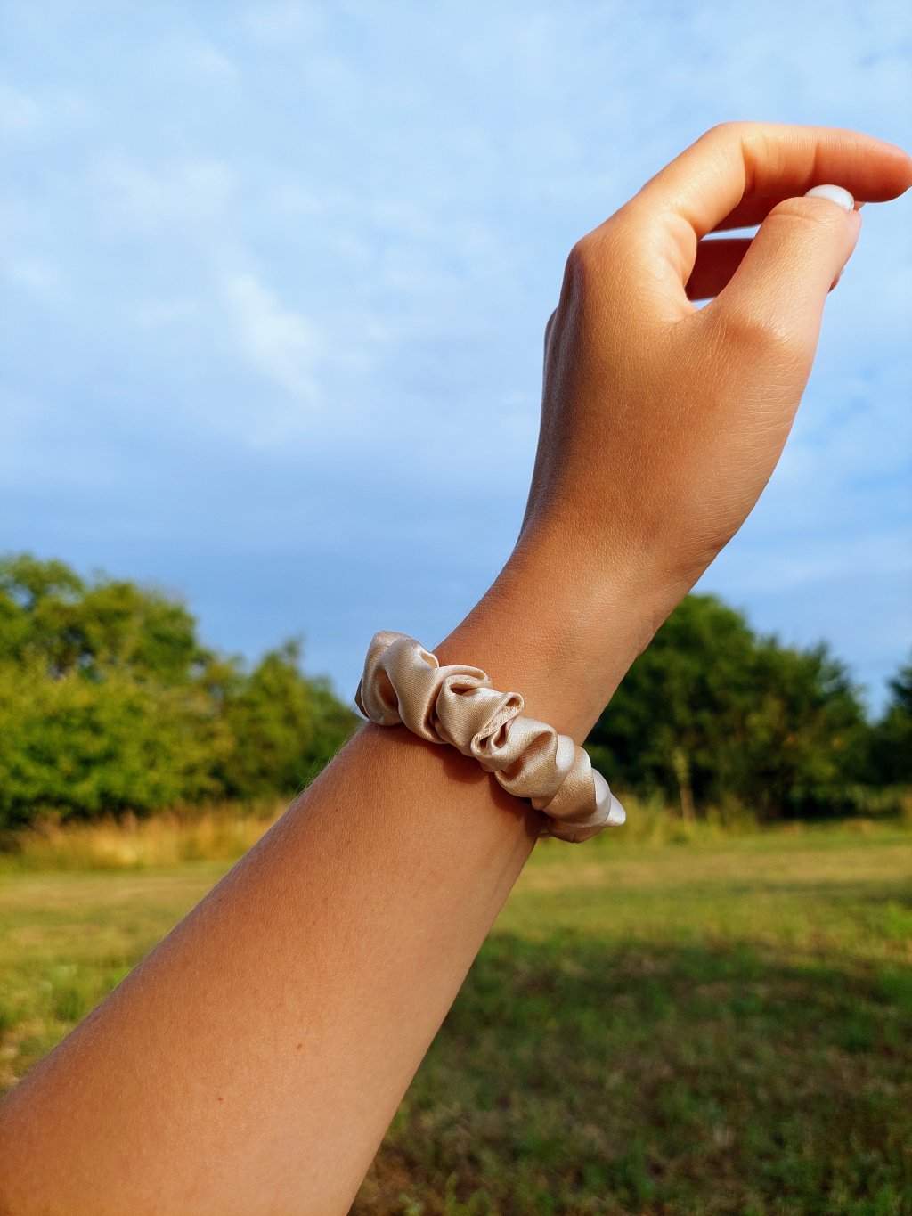 Luxusní doplněk ze 100% hedvábí v béžové barvě. Scruchie gumička dodá účesu trochu luxusu. Nedochází k poškození nebo tahání vlasů. Její krásná béžová barva dodá vašim účesům neutrální a přirozený vzhled. Ideální pro všechny typy vlasů.
