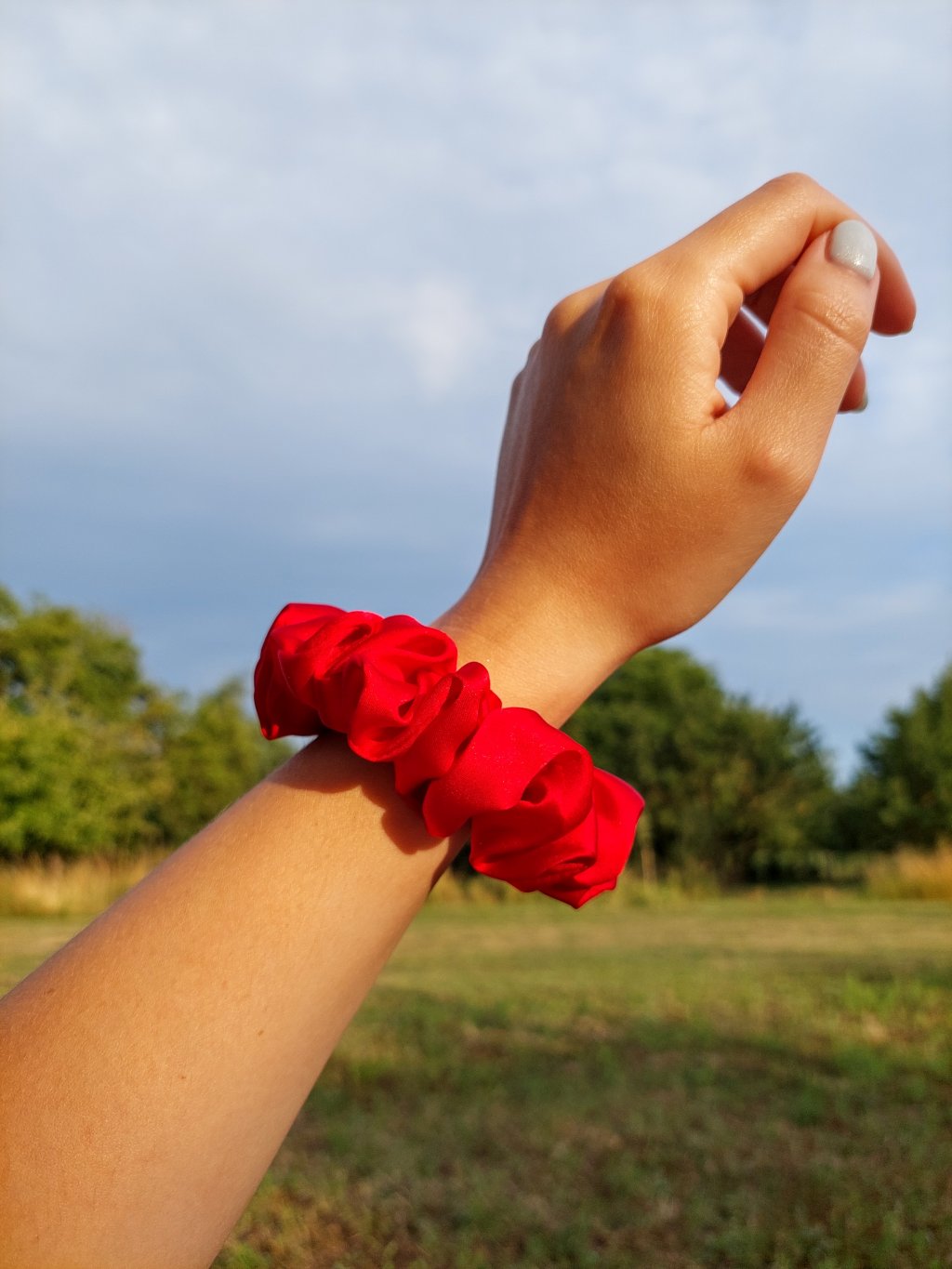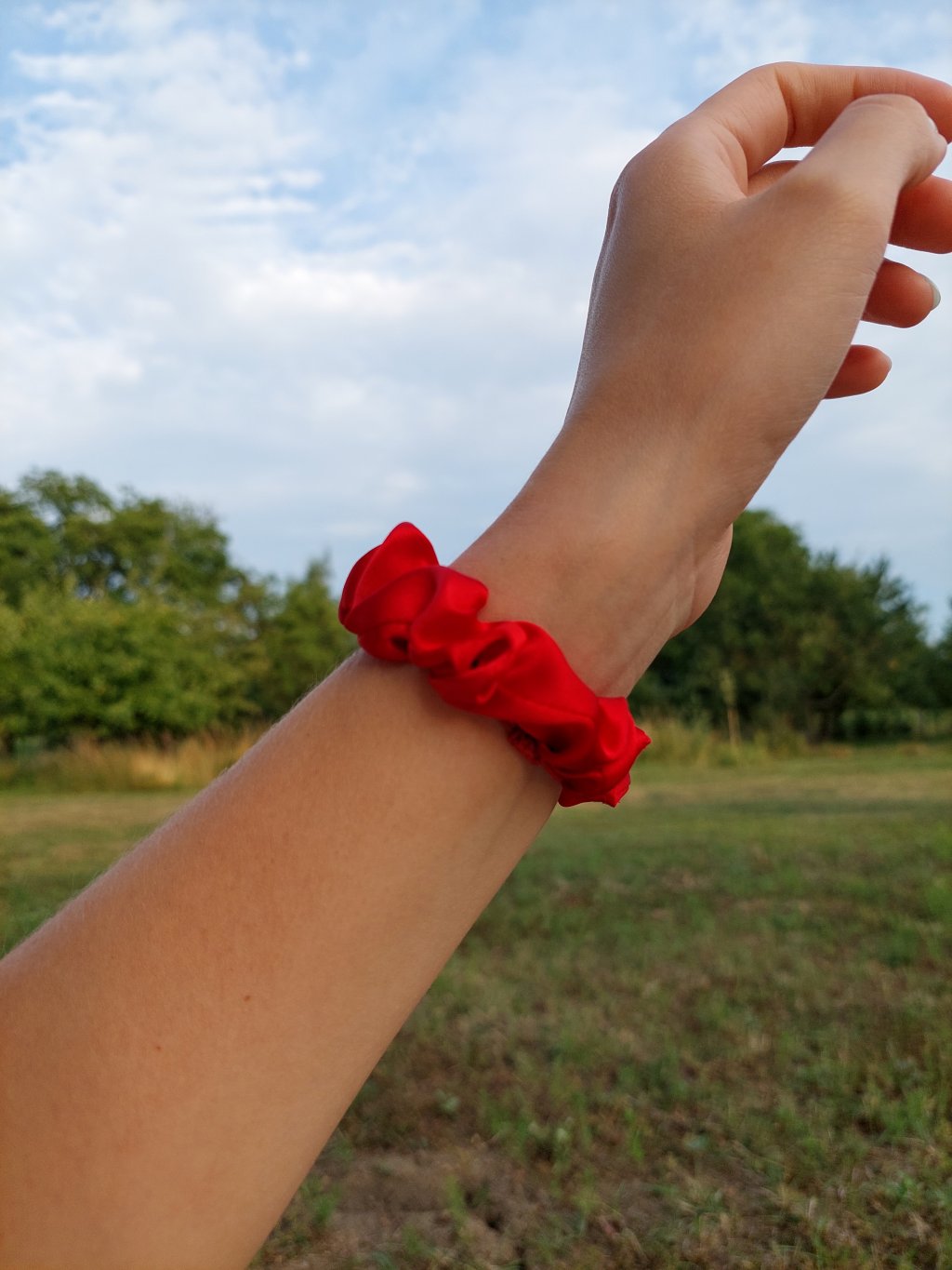 Červená hedvábná scrunchie gumička