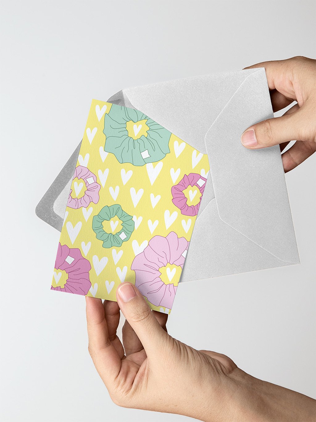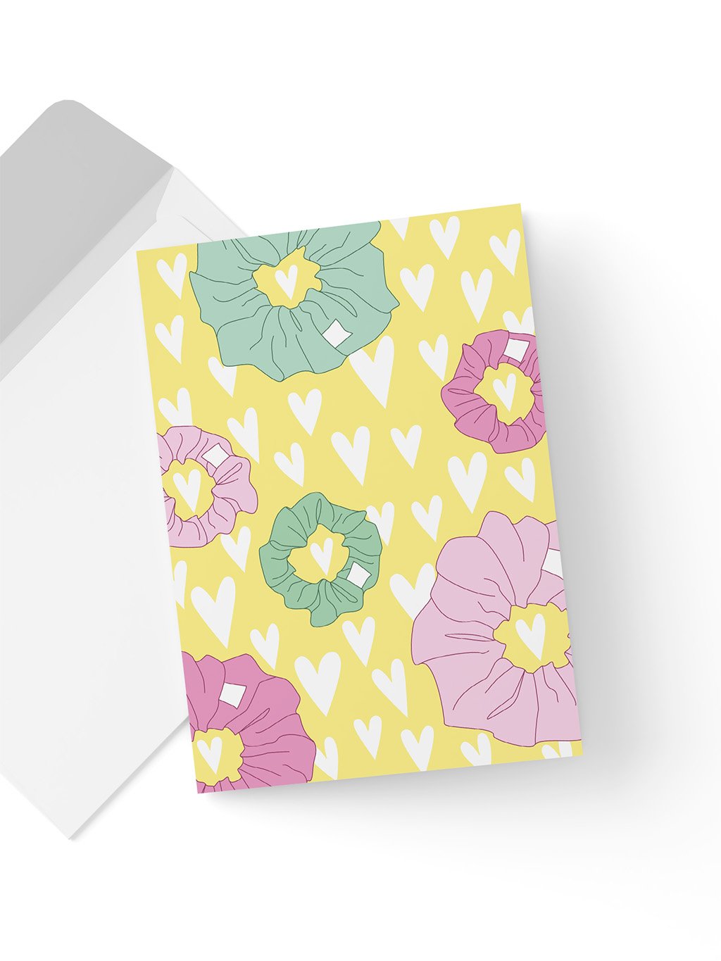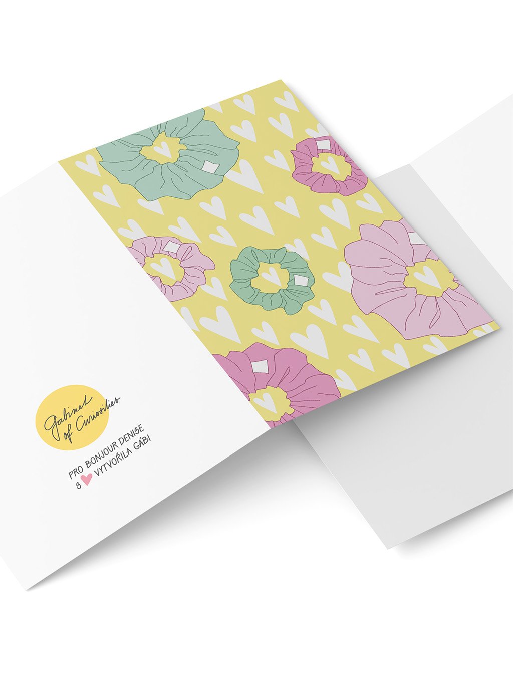 Jemné přání s motivem scrunchie gumiček a srdíček – ideální jako milý doplněk ke scrunchie hedvábné gumičce nebo jen tak pro radost.
