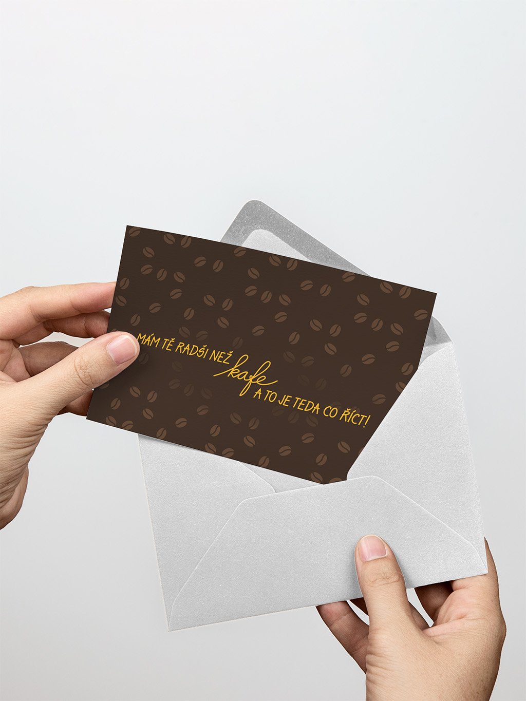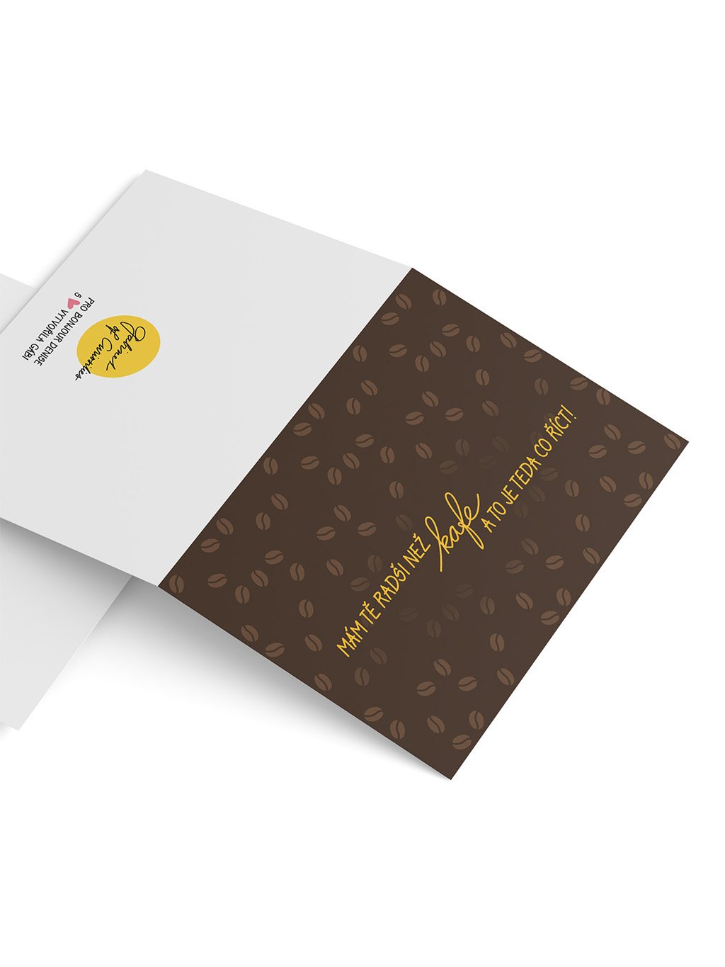 Tmavě hnědé přání s jemným motivem kávových zrnek a vzkazem „Mám tě radši než kafe a to je co říct!“ udělá radost partnerovi, partnerce, kamarádovi i kamarádce.
