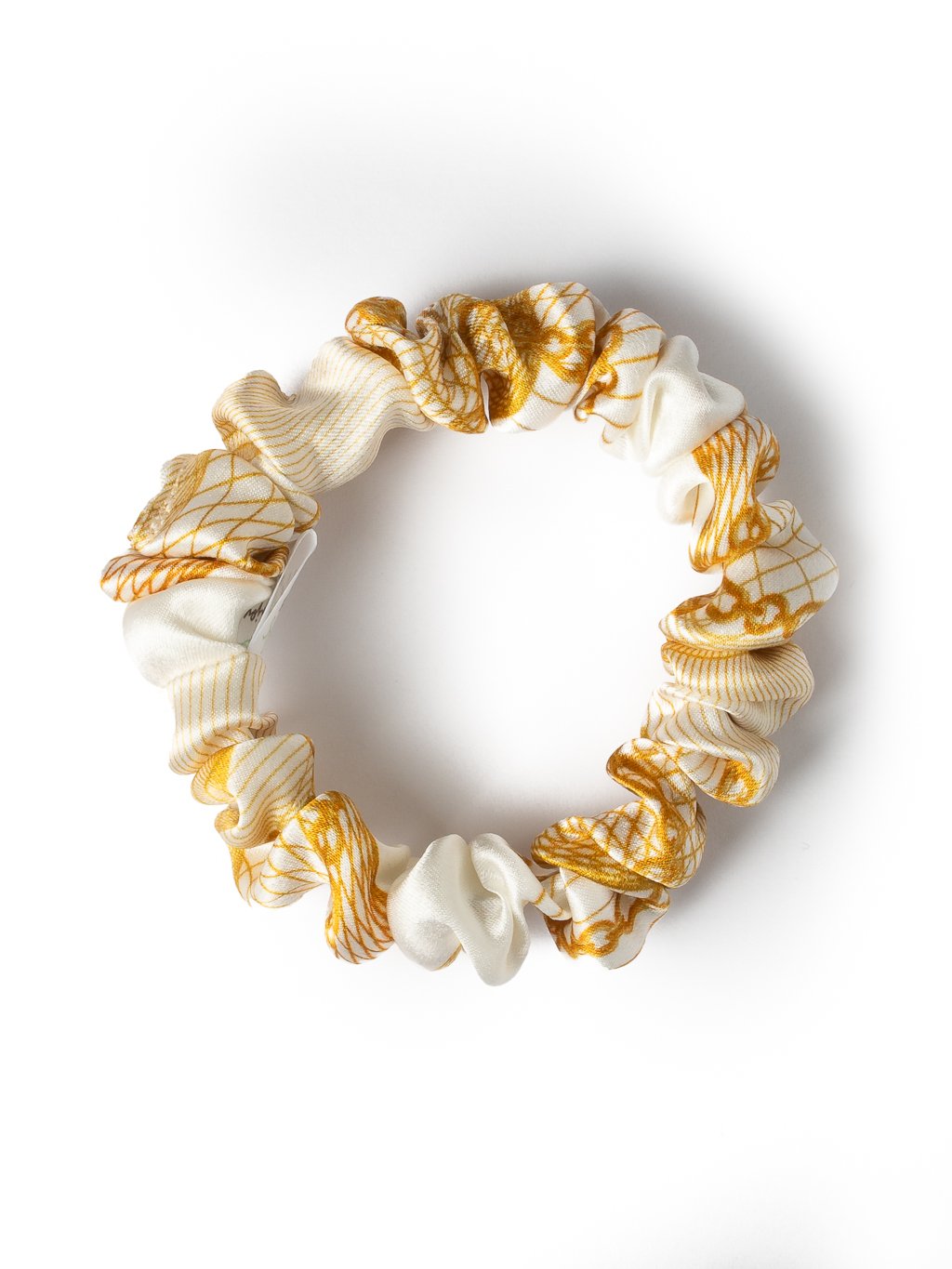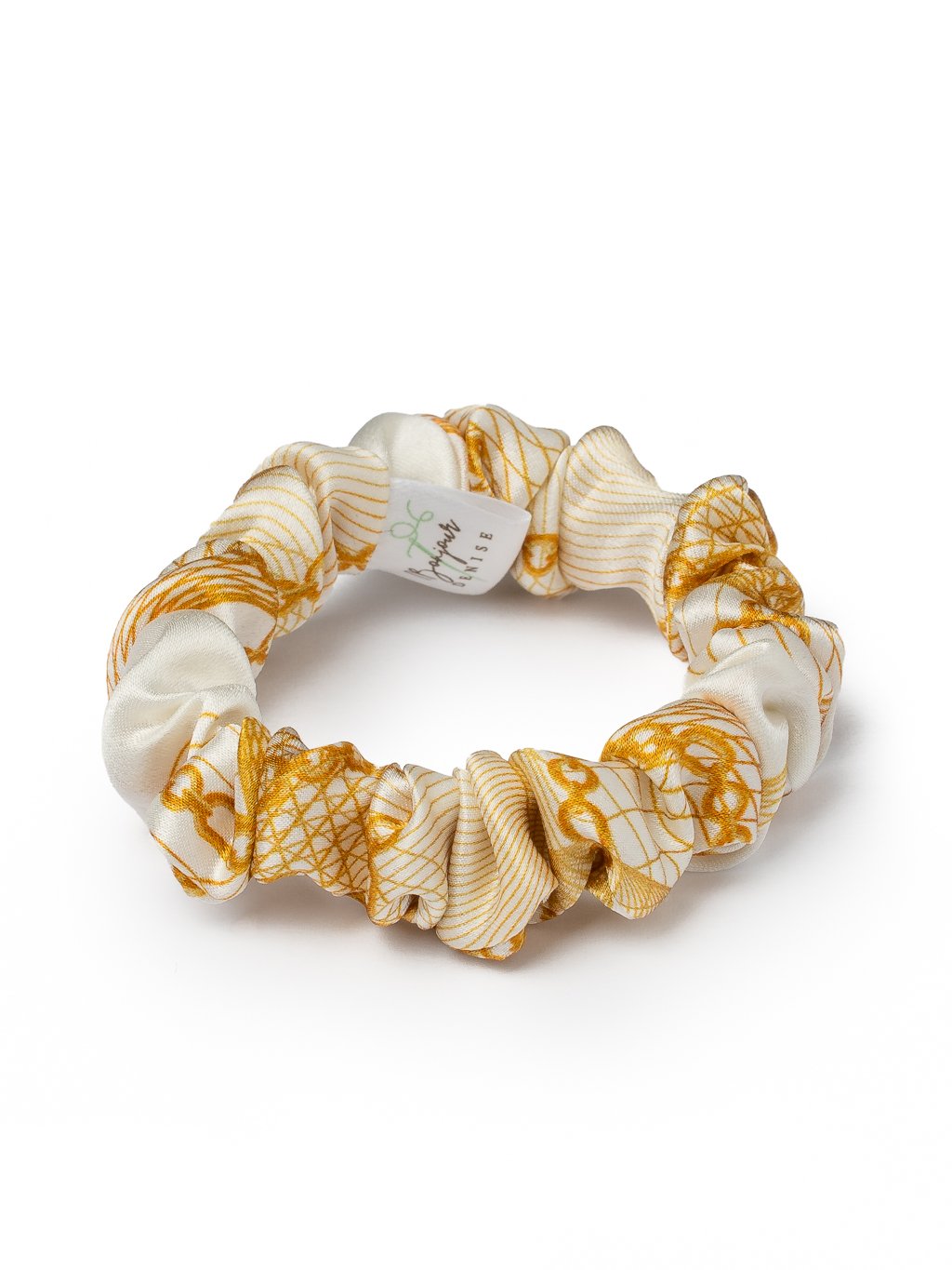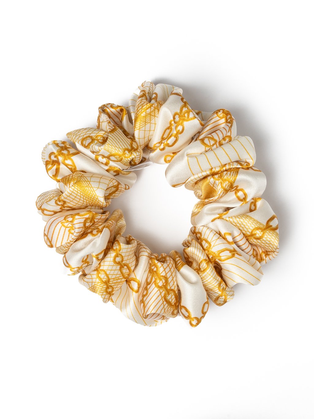 Tato scrunchie gumička je vyrobena ze 100% hedvábí, což z ní dělá jedinečný a luxusní doplněk pro vaše vlasy. Její krásný řetízkový vzor dodá vašim účesům elegantní vzhled.