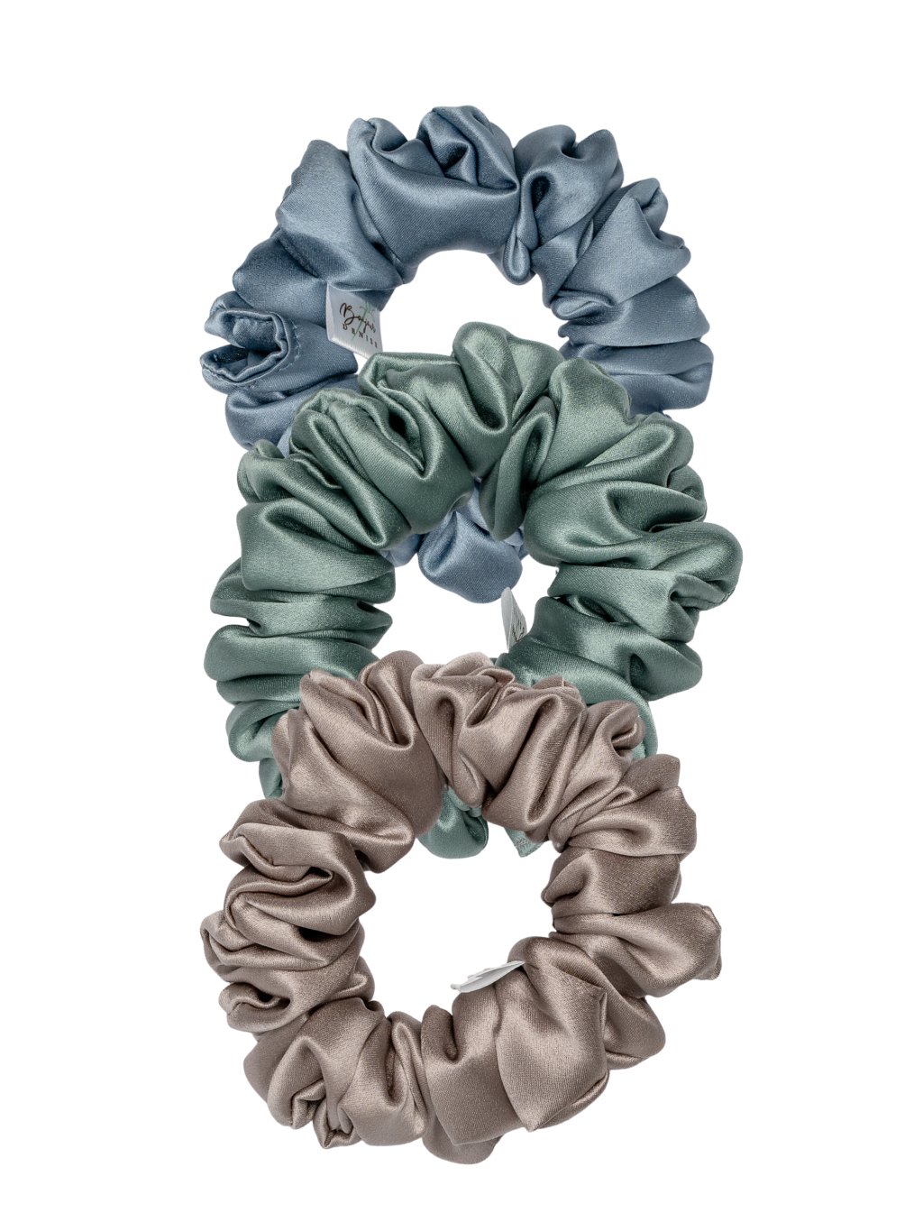 Set hedvábných scrunchies gumiček v barvách ocelově modrá, zelenošedá a taupe. Velikost normální.