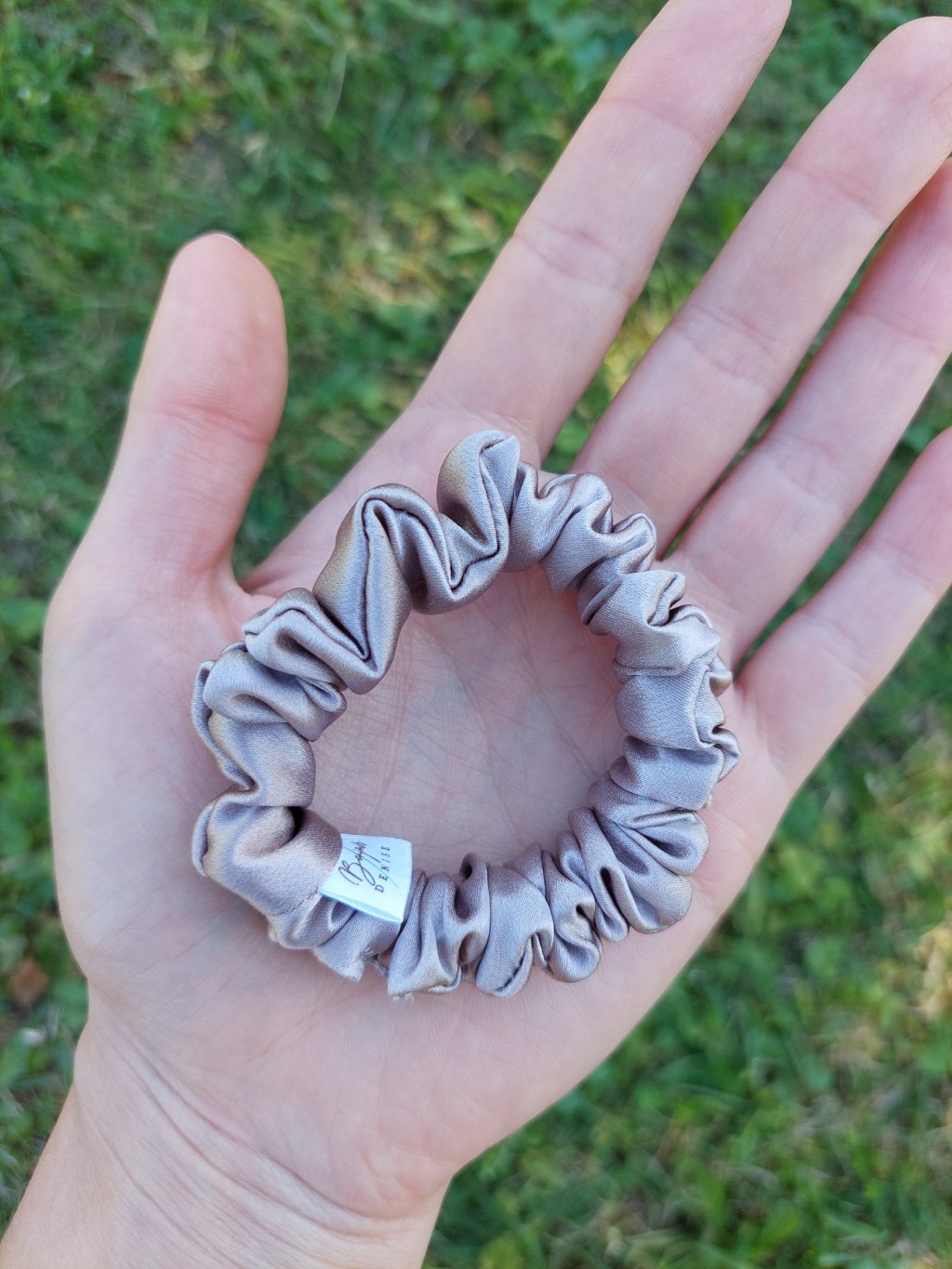 Tato scrunchie gumička je vyrobena ze 100% hedvábí, což z ní dělá jedinečný a luxusní doplněk pro vaše vlasy. Její krásná hnšdošedá barva dodá vašim účesům jemnost.