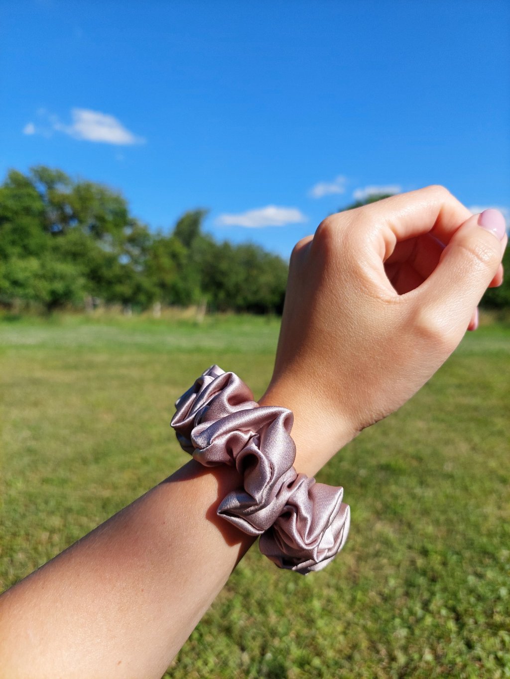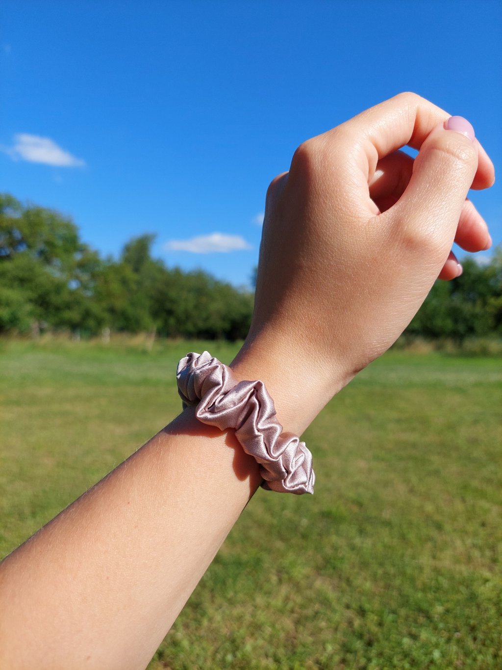 Taupe hedvábná scrunchie gumička