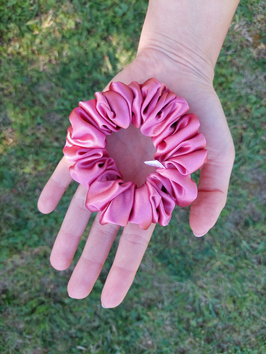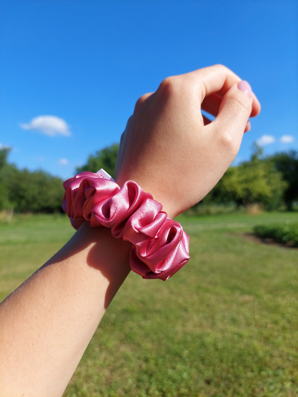 Tato scrunchie gumička je vyrobena ze 100% hedvábí, což z ní dělá jedinečný a luxusní doplněk pro vaše vlasy. Její krásná tmavě růžová barva dodá vašim účesům šmrnc.