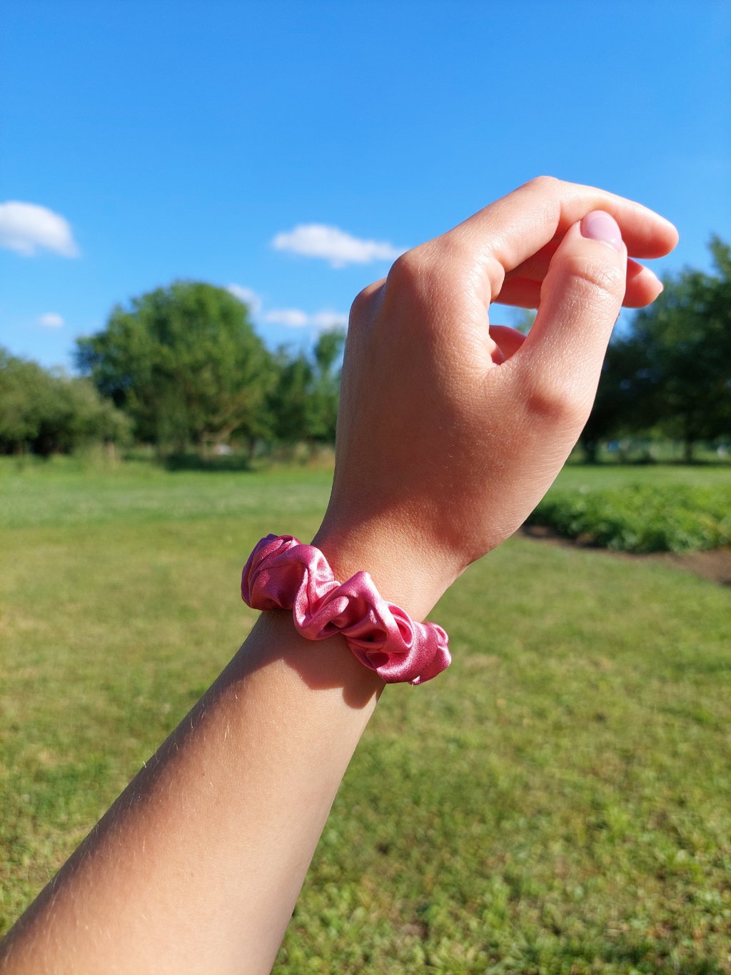 Luxusní doplněk ze 100% hedvábí v tmavě růžové barvě. Scrunchie gumička dodá účesu trochu luxusu. Nedochází k poškození nebo tahání vlasů. Její krásná tmavě růžová barva dodá vašim účesům šmrnc. Ideální pro všechny typy vlasů.
