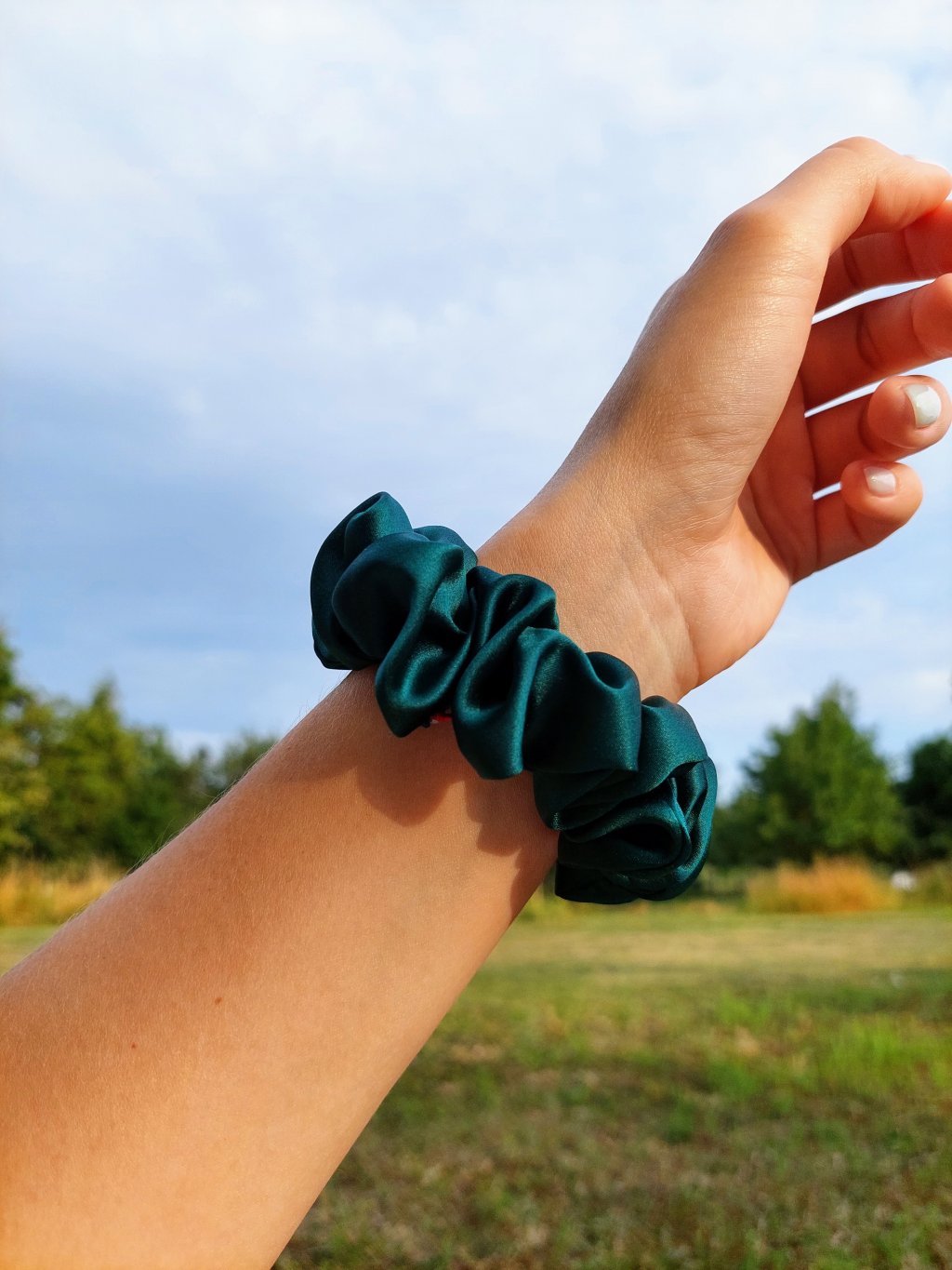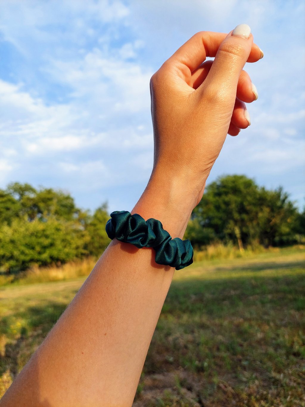 Luxusní doplněk ze 100% hedvábí v zelené barvě. Scrunchie gumička dodá účesu trochu luxusu. Nedochází k poškození nebo tahání vlasů. Její krásná zelená barva dodá vašim účesům svěží vzhled. Ideální pro všechny typy vlasů.